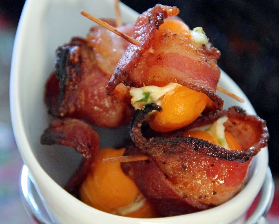 ИНГРЕДИЕНТЫ: 24 абрикоса (+ 24 вымоченных в воде зубочистки), натертый сыр хаварти, 12 полосок бекона, нарезанного вдоль на 2 части, 24 шт миндаля, свежемолотый черный перец.