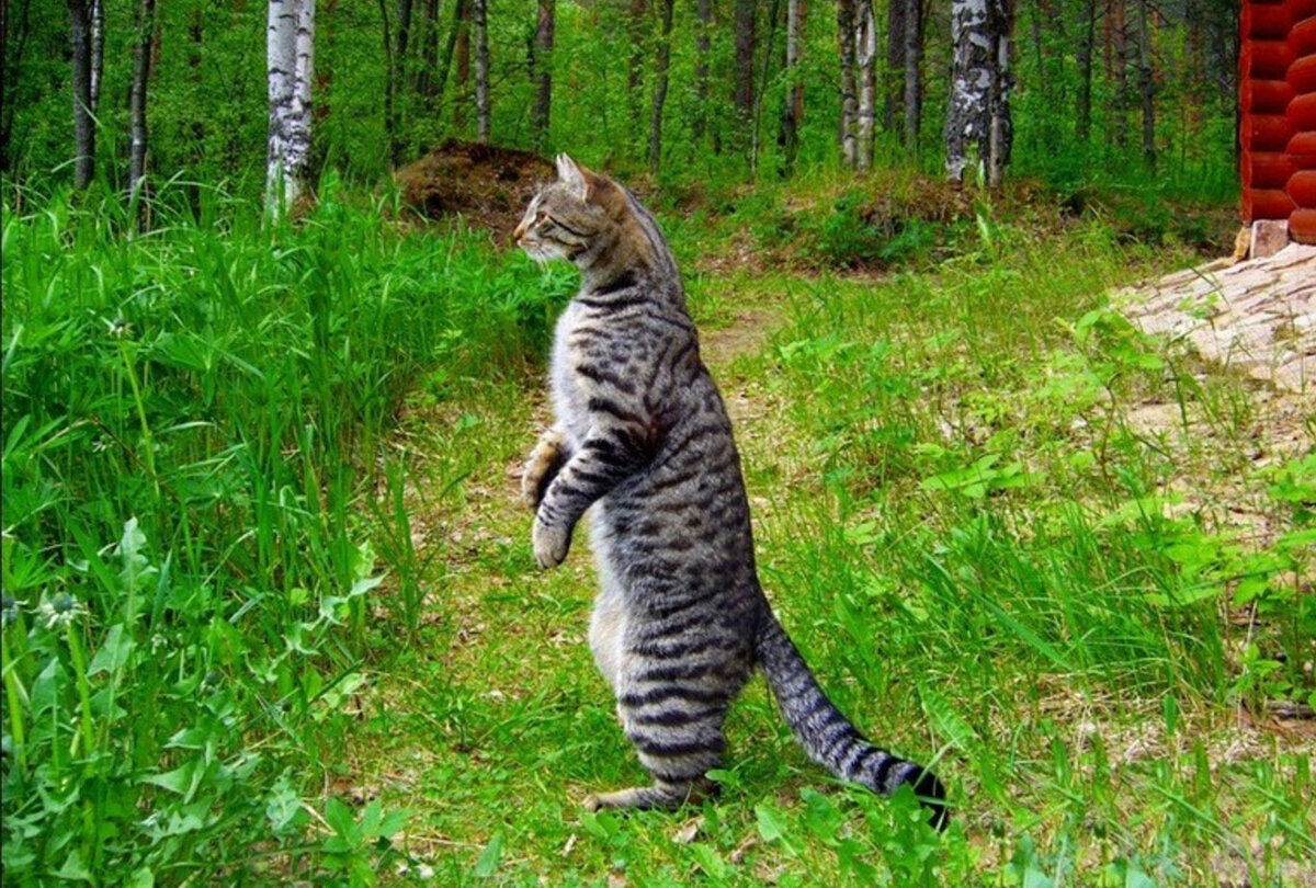 Может, кошки притворяются четвероногими, чтобы получать от нас различные блага, а на самом деле они – инопланетная раса таких же прямоходящих существ, как мы? Вот и ходят так, когда мы не видим. Собаке, например, трудно удержать тело в таком положении, да и не любит она пользоваться этой позой, а кошке сидеть так проще простого. Она может замереть столбиком на несколько минут, не шелохнувшись. Была бы причина. :) Чтобы привести тело в вертикальное положение, она встает на задние лапы и приземляется на скакательные суставы. Удерживаться в таком положении ей несложно, так как у нее отличная координация, гибкое тело и удобное строение лап. Но пользуется этой позой кошка редко. Поэтому когда хозяин видит ее в столбике, его это удивляет, озадачивает и смешит. Кошки – малорослики, а мир такой огромный. Если кошке, в силу роста, какая-то преграда мешает рассмотреть интересующий ее объект, кошка встает в столбик. Да, она могла бы обойти, но если что-то где-то шумит, значит оно может быть