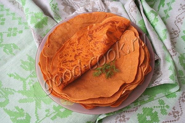 https://www.good-cook.ru/tort/tort_1139.shtml Блины имеют необычный красивый красноватый цвет и вкусный томатно-чесночно-укропный аромат. Вкус у них с приятной солоноватостью.