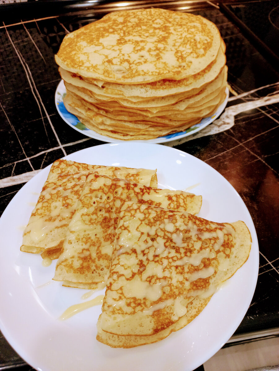 Вот и снова - Масленица, а с ней - главное блюдо Масленичной недели: блины. Сегодня представляю классический рецепт настоящих русских блинов. Признаюсь, делала их впервые, но результат превзошел мои ожидания. Для приготовления блинов необходимы следующие продукты: мука пшеничная в/с - 400г, яйца (СО) - 2 шт, сахар - 45 г, масло сливочное - 30 г, дрожжи сухие - 5 г, соль - 5 г, молоко - 600 г, ванилин. Молоко нагреть до температуры 36-38 градусов С, всыпать сухие дрожжи, сахар и часть муки, примерно 1/3 часть и замесить до однородной массы опару. По истечение 30-40 минут, добавить в опару соль, ванилин, взбитые яйца и замесить тесто, в конце замеса добавить растопленное сливочное масло. Тесто можно замешивать миксером, используя насадки для теста. Готовое тесто имеет густую, но текущую консистенцию. Посуду с тестом накрыть крышкой, оставить в теплом месте для брожения на 40-45 минут. Готовое тесто тщательно перемешать. Выпекать блины на разогретой сковороде (средний нагрев), слегка с