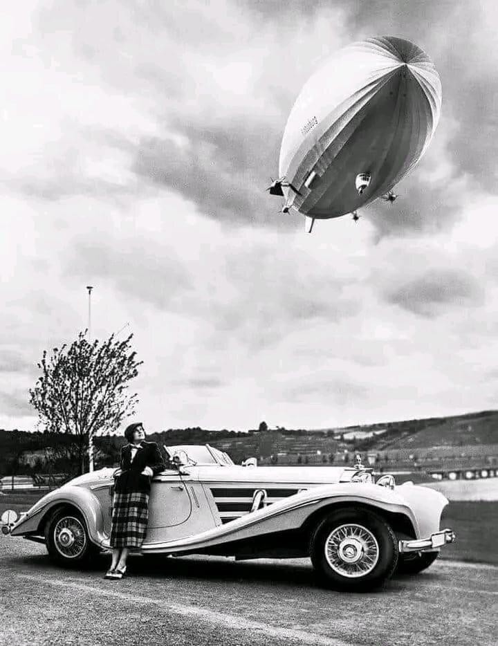 Фотография о которой я сегодня хочу рассказать действительно может поведать, о тех кто на ней изображен, очень многое. И это не смотря на то, что она давно ходит по просторам интернета. Тем не менее, и девушка, и автомобиль и дирижабль заслуживают отдельного упоминания.