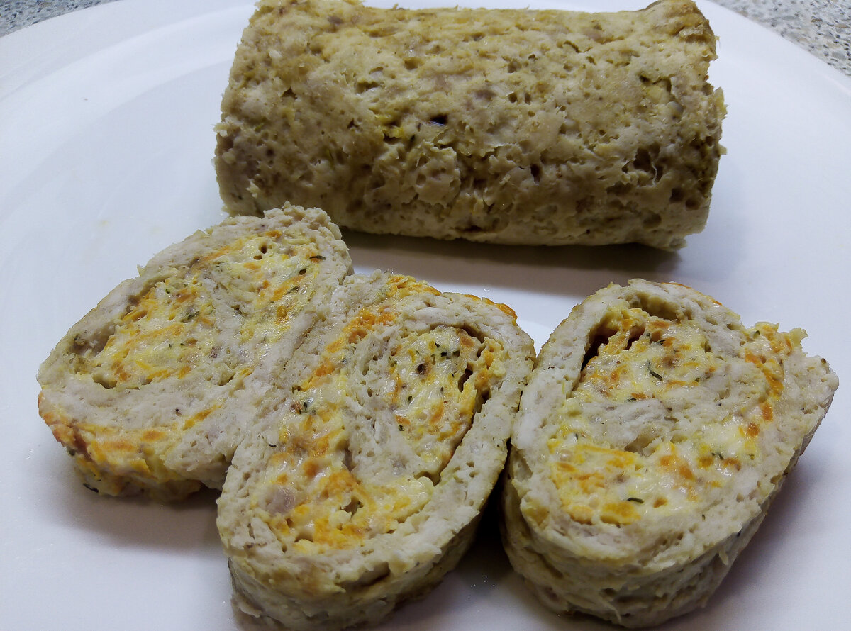 Вам понадобится : Фарш 450 грамм 1/2 морковки 70 грамм сыра плавленного колбасного копчёного 2 зубчика чеснока Зелень укропа 1 яйцо Специи Сделайте фарш без добавок ( + 2 зубчика чеснока + 1 луковица) Посолить, добавьте специю для мяса 1 ст. ложка соуса чили сладко - кислого Смешайте фарш Возьмите лист, застелите его плёнкой для запекания. Выложите фарш на лист и распределите, не более 1.5 см. Сделайте фарш - начинку Потрите сыр плавленый колбасный копчёный Добавьте рубленный чеснок и зелень. Потрите морковь добавьте в начинку Далее разбейте 1 яйцо Добавьте 1 ст. ложку майонеза Смешайте начинку Посолить, поперчить Смешайте начинку. Лист с мясом запеките 15 минут - 190 градусов. Потом достаньте , немного остудите и выложите начинку Распределите начинку по всей поверхности фарша. Осторожно заверните рулет Поставьте выпекать ещё на 35 минут. Рулет готов. Остудить и осторожно снять плёнку. Есть его нужно холодным. Это очень вкусно, лучше чем колбаска на завтрак