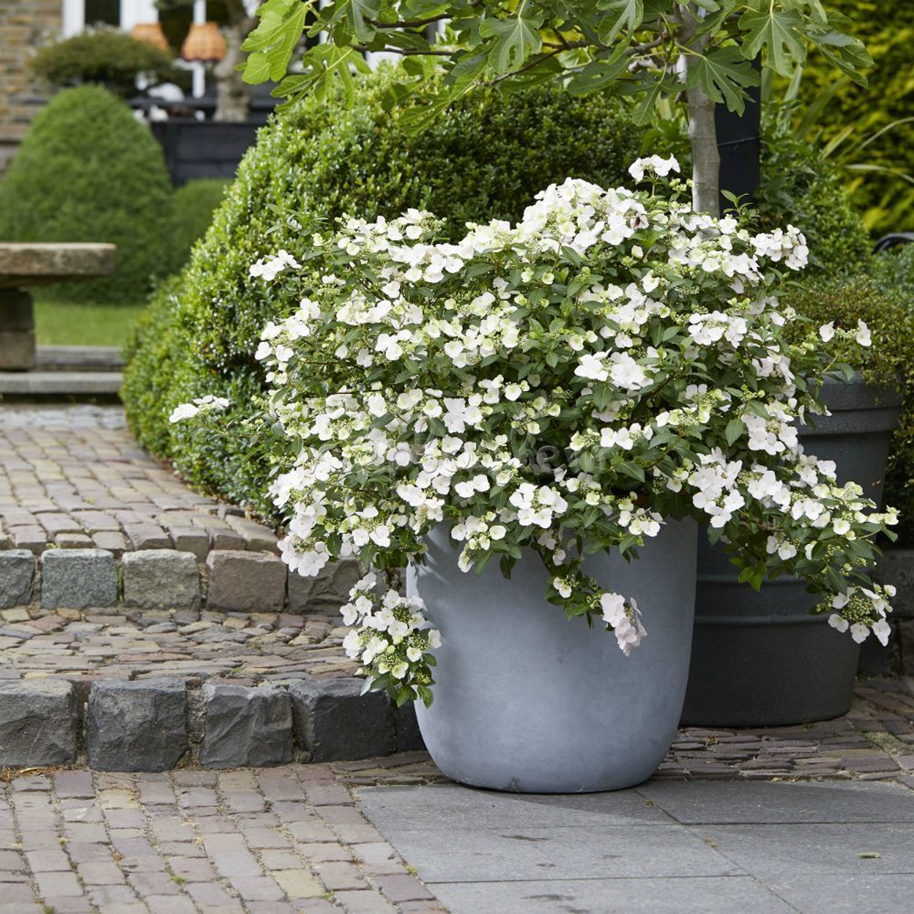 созданная японским селекционером Ushio Sakazaki, в 2018 году была признана лучшим растением на выставке в Челси (RHS). Во время цветения эта красавица полностью покрыта крупными белыми цветами, напоминая белый шар. Кустик высотой до 50 см. разрастается в ширину до 100 см. Побеги ветвистые, ниспадающие до 40 см. Уникальность Сбежавшей невесты – это не только ампельная форма, но и раннее цветение, которое начинается уже в мае. Вторая волна цветения наступает во второй половине лета и продолжается уже до заморозков. Стерильные белоснежные цветы в диаметре достигают 5 см., они появляются не только на концах побегов, но и из боковых пазух, что придает гортензии невероятно эффектный вид. Каждая ветка усыпана крупными снежно-белыми цветками с ажурным краем лепестков. При понижении температуры цветы приобретают легкий розовый оттенок. Летом листья темно-зеленого цвета, гладкие, длинной до 12 см., к осени становятся бордового цвета. Гортензия Сбежавшая невеста, несомненно, станет звездой вашего