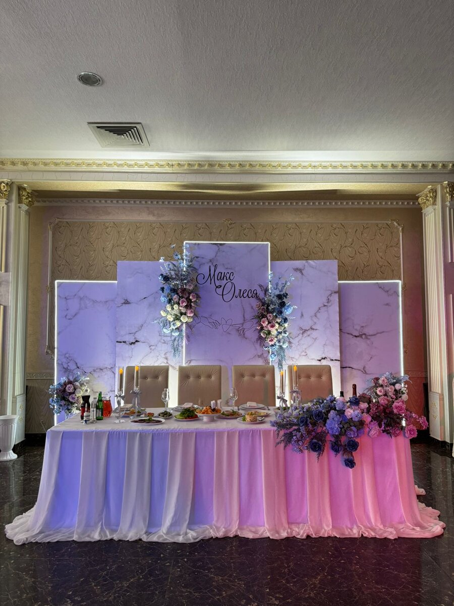 Предложения по декору: Предложение за 25 000 рублей включено: 1. Задник, фон за молодыми (цветы искусственные и ткани - любая цветовая палитра, нионы - любое световое оформление). 2. Президиум, стол молодых (цветы искуственные и ткани - любая цветовая палитра). 3. Небольшие композиции на гостевые столы (до 5 шт) возможно любое количество. Предложение за 35 000 рублей включено: 1. Задник, фон за молодыми (цветы искусственные и ткани - любая цветовая палитра, нионы - любое световое оформление). 2. Президиум, стол молодых (цветы искуственные и ткани - любая цветовая палитра. 3. Высокие стойки (метровые, с подсветкой и со стеклярусами) с большими омпозициями на гостевые столы (до 5 шт) возможно любое кол-во. Предложение за 50 000 рублей включено: 1. Задник, фон за молодыми (цветы искусственные и ткани - любая цветовая палитра, нионы - любое световое оформление). 2. Президиум, стол молодых (цветы искусственные и ткани - любая цветовая палитра). 3. До 5 (возможно любое количество) к