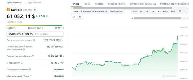 Главная криптовалюта преодолела важную отметку. Аналитики считают, что до конца роста еще далеко.28 февраля цена биткоина превысила значение $60 тыс. Это случилось впервые с ноября 2021 года, следует из данных CoinGecko. Если взлет курса продолжится и криптовалюта переступит рубеж в $70 тыс., то будет установлен новый исторический максимум. Ранее эксперты банковской группы Standard Chartered прогнозировали биткоину небывалый рост. По их мнению, криптовалюта может достигнуть отметки $200 тыс. к концу 2025 года. Изменения на рынке криптовалют связывают с ажиотажным спросом на биткоин-ETF. В частности, за 27 февраля объем торгов в спотовых биржевых фондах (ETF) на биткоин в США превысил $2 млрд, уточняет РБК. Фонды показывают рекордный оборот с момента их запуска в январе. Тем временем в Дубае представили «Биткоин-небоскреб». Это огромный отель, который будет состоять из 40 этажей. Он станет памятником биткоину и Сатоши Накамото (создатель BTC).