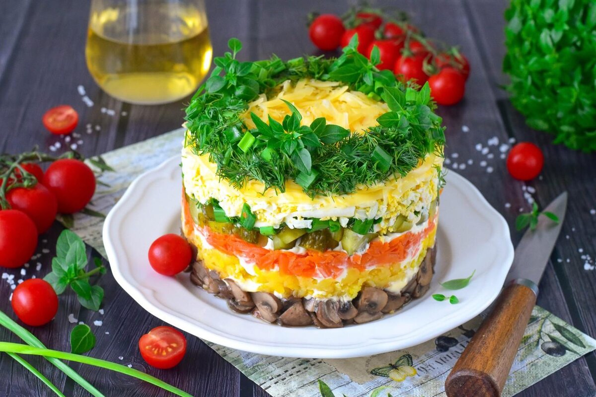 Ингредиенты: Шампиньоны 300 гр. Картошка - 2 шт. Морковь – 2 шт. Солёные огурцы – 1-2 шт. Твёрдый сыр – 100 гр. Куриные яйца -3 шт. Лук – 1 шт. Майонез – 4 стол. Ложки Зелёный лук – небольшой пучок Укроп Перец чёрный молотый – по вкусу Соль – по вкусу Подготавливаем все необходимые ингредиенты по списку. Майонез можете заменить на сметану или смешать сметану и майонез в равных пропорциях. Шампиньоны вымойте, обсушите и нарежьте кубиками. Лук очистите от шелухи и нарежьте мелкими кубиками. В разогретую сковороду налейте немного растительного масла и, помешивая, обжарьте грибы с луком до готовности. В конце шампиньоны посолите и поперчите. Если в сковороде осталось много жира, переложите грибы на бумажные полотенца. Грибы можете взять маринованные или соленые, и тогда жарить их не нужно. Картофель отварите в кожуре до готовности, охладите и очистите. Затем натрите на крупной терке. Соленые огурцы нарежьте небольшими кубиками. Соленые огурцы можете заменить на маринованные. Морковь отвари