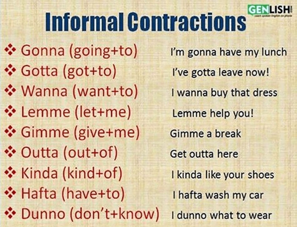 В разговорном английском, то есть, на том, на котором обычные люди, а не только лондонские сэры, общаются и сочиняют рэпчик, встречаются сокращения, которые придают речи оттенок неформальности. Вот самые основные: