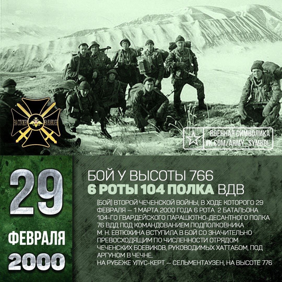 В этот день, 29 февраля — 1 марта 2000 года, 6-я рота 2-го батальона 104-го гвардейского парашютно-десантного полка 76-й гвардейской воздушно-десантной дивизии (Псковской) под командованием гвардии подполковника М.Н.Евтюхина на высоте 776 в Аргунском ущелье под Улус-Кертом, Чечня, вступила в неравный бой с боевиками. Десантники предотвратили прорыв группировки незаконных вооружённых формирований, приняв бой с превосходящими силами террористов. Боевикам (до 2500) противостояли 90 десантников, 84 из которых героически пали в бою. https://bryansknovosti.ru/?p=385586