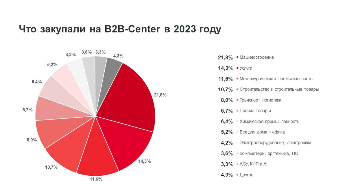 В 2023 году на площадке В2В-Сenter состоялось более 230 тыс. торговых процедур на сумму свыше 5 трлн руб. По результатам года ключевые показатели активности клиентов выросли на 4% по количеству процедур и на 25% по общему объему закупок. Экономическая ситуация в большинстве отраслей относительно стабилизировалась, что повлекло рост числа и объемов закупок у крупнейших компаний. Самыми закупаемыми категориями стали продукция машиностроения и металлургии, стабильно востребованы различные виды b2b-услуг. В 2023 году на площадке вырос спрос на строительные товары и услуги, а также ИТ-продукцию. При этом произошло снижение запросов на транспортно-логистические услуги. Продукция машиностроения. Доля закупок товаров и услуг этого сегмента увеличилась до 22% от общего числа процедур на B2B-Center. В числе наиболее востребованных позиций остаются станки и оборудование для металлургической и горнодобывающей промышленности. Значительную долю занимают закупки запчастей – деталей узлов и механизмов