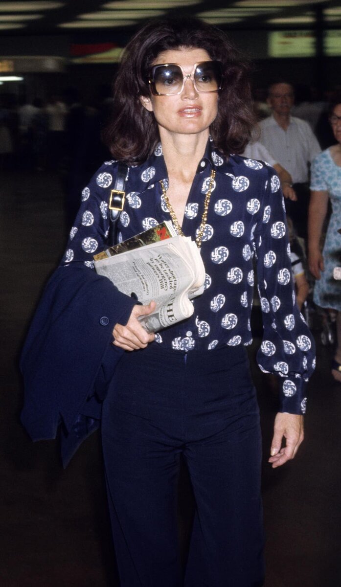 Никто не умел одеваться в путешествиях лучше, чем Джеки. В 1970 году она была запечатлена в лондонском аэропорту Хитроу в пальто от Yves Saint Laurent, водолазке и очках крупного размера.