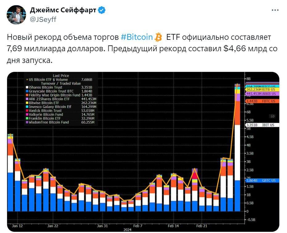 Объёмы торгов для десяти Биткоин ETF США установили новый рекорд, более чем вдвое превысив предыдущий максимум. По данным, аналитика Bloomberg ETF Джеймса Сейффарта, 28 февраля объём десяти ETF составил $7,69 млрд. Предыдущий рекорд составлял $4,66 млрд в день запуска 11 января. ETF компании BlackRock занял 43,5% от общей суммы, обеспечив объём торгов в размере $3,35 млрд и удвоив предыдущий дневной рекорд. Это и стало основной причиной пампа BTC до $64 тыс, ведь интерес к BTC со стороны институциональных инвесторов растёт очень быстрыми темпами.
