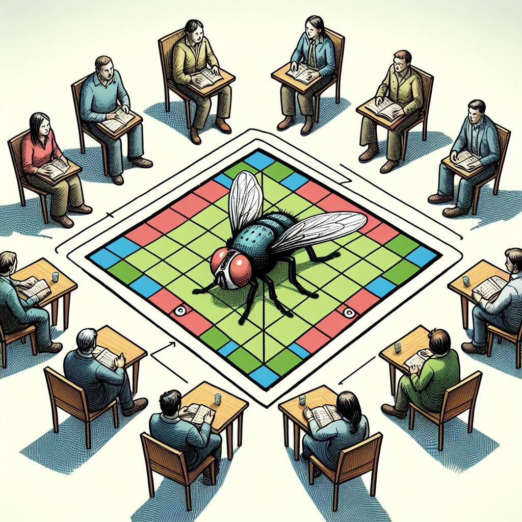 Игра «Муха в клетке» — это воображаемая игра, в которой игроки визуализируют муху, перемещающуюся по воображаемому полю в соответствии с движениями каждого игрока. Эта игра тренирует концентрацию, зрительное воображение и пространственное мышление, поскольку игрокам приходится постоянно отслеживать положение мухи мысленным взором. Для начала игроки согласовывают размер клетки — обычно это сетка 3x3, 4x4 или 5x5. Более продвинутые игроки могут представить клетку в виде трехмерного куба, также разделенного на ячейки. Один игрок начинает с того, что говорит "муха в центре" и сообщает куда он хочет, чтобы муха двигалась — вверх, вниз, влево-вправо, ближе или дальше (в случае если игровое поле это трехмерный куб). Например: «Муха поднимается на одну клетку вверх». Затем другие игроки должны визуализировать и отслеживать в уме новое положение мухи. На следующем ходу следующий игрок объявляет следующий ход мухи. По правилам нельзя ходить так, чтобы отменялся ход последнего игрока. Игра продол