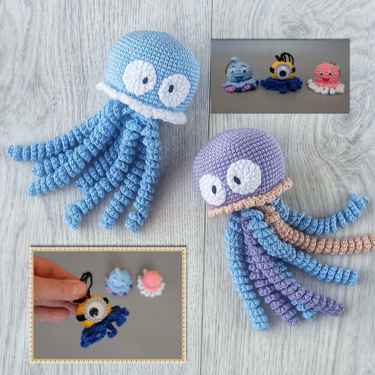 Амигуруми. Своими руками. Связать игрушку. Вяжем крючком. Два мастер - класса "Осьминожки" и "Медузы". Готовим подарки своими руками. Жители морских глубин - постоянно пользуются спросом. На всех ярмарках у меня постоянно спрашивают медуз, осьминожек, китов, рыбок. Причём как больших размеров, так и маленьких, в виде брелочков. Больших осьминогов или медуз, признаюсь честно, я еще не вязала, а вот брелочки вяжу на каждую ярмарку постоянно. Сегодня в РУКОДЕЛЬНУЮ КОПИЛКУ я сохранила: Всё просто и понятно. Можно медуз и осьминожек вязать и из плюшевой пряжи, тоже получаются милые создания. У меня на канале Мастерская ЧАЙКА есть видео мастер - класс как связать брелок "Осьминожку": Я немного поэкспериментировала и создала осьминожку миньона. Сначала идея мне показалась бредовой, но я, как всегда, для теста новой игрушки связала пяток. Ушли сразу. Теперь всегда, готовясь к ярмаркам, вяжу осьминожек 50х50. Половину традиционных, разных цветов, половину миньончиков. А ещё, мне понравился в