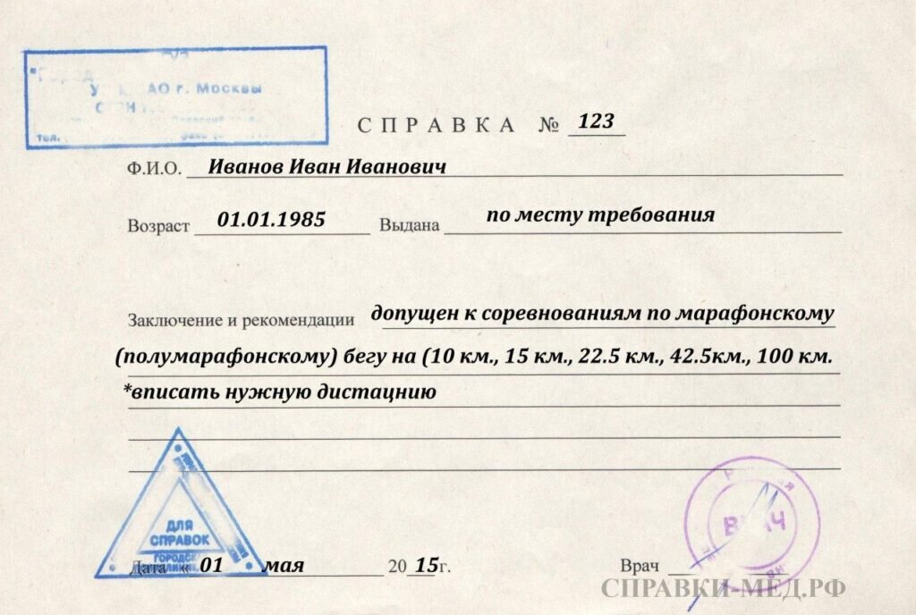 То есть она нужна, чтобы на забег были допущены только «здоровые» люди, которые прошли предварительное обследование в условиях клиники. Ну, и организаторам она нужна, чтобы в случае, если вы умрете на забеге, они достали эту справку и показали следователю «вот, товарищ следователь, посмотрите, настоящий доктор поставил свою печать и подпись под тем, что этот человек мог участвовать в соревнованиях».