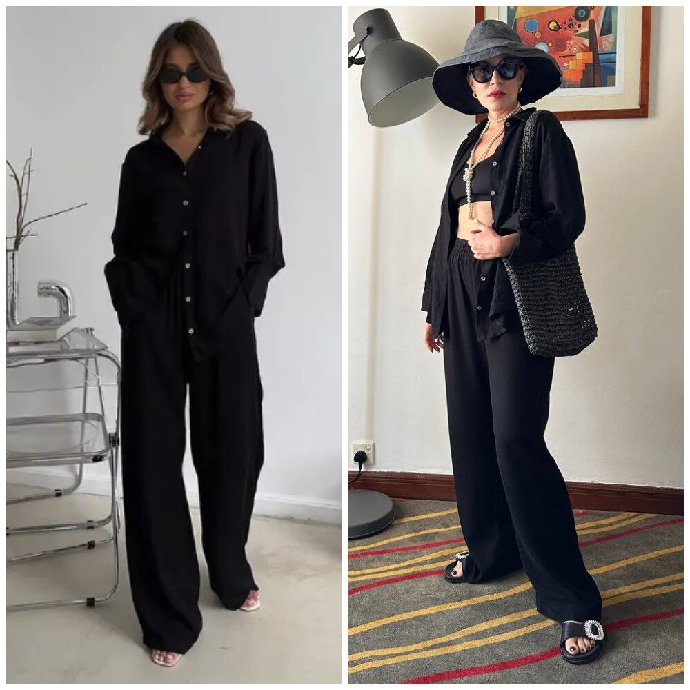 ✅Основной канал: Стильно - не значит дорого! Ставьте лайк в поддержку канала, и давайте смотреть на мою сегодняшнюю покупку. Недавно я была на отдыхе, и мне очень пригодился этот костюм, который я покупала как раз к отпуску. С ним получаются не только стильные, но еще и функциональные летние образы (смотрите видео). Он легкий, очень комфортный в жаркую погоду. Можно носить и дома. Есть большой выбор цветов, но мне захотелось базы, поэтому взяла себе черный. Костюм состоит из свободной рубашки и широких брюк на резинке, которые, конечно, можно носить и по-отдельности. В брюках не жарко за счет материала и неплотного облегания, а рубашка надежно защищает плечи от опасного солнца, при этом позволяя коже дышать. Размерный ряд костюма до 56 размера. Видео-обз
