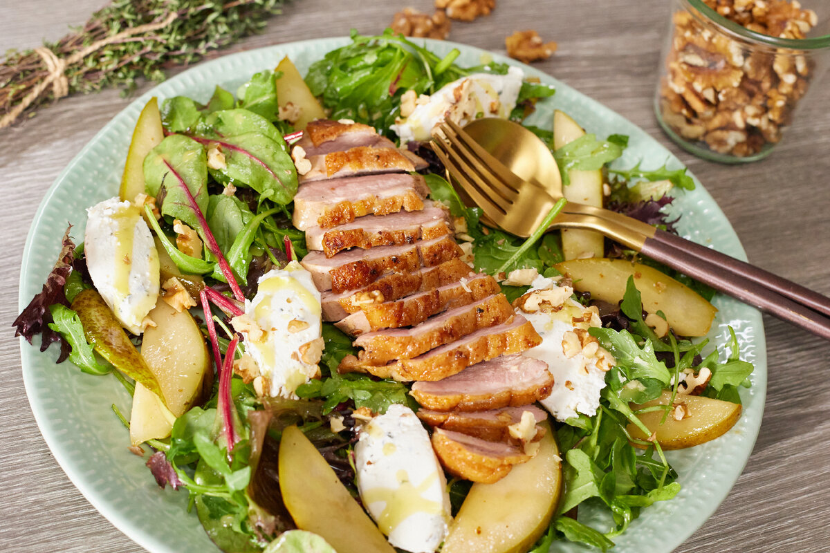 Ингредиенты Утиная грудка 300 г Груша 1 шт. Микс салатных листьев 60 г Творожный сливочный сыр 50 г Тимьян свежий 4 веточки Мёд 40 г Дижонская горчица 1 ч. ложка Винный уксус 20 мл Оливковое масло 20 мл Сливочное масло 20 г Лимон (сок) ¼ шт. Грецкие орехи 10 г Соль Перец Приготовление 1. На утиной коже сделать надрезы крест-накрест и отправить на сковороду кожей вниз на минимальный нагрев. Обжаривать со всех сторон до золотистой корочки, а в середине обжаривания утку поперчить и посолить. Обжаренную, но ещё упругую грудку завернуть в фольгу и оставить доходить до готовности. Затем перед подачей нарезать на слайсы средней толщины. Совет от шефа: «Утиное мясо лучше обжаривать без масла, так как при температуре вытапливается жир, которого будет достаточно для приготовления грудки». 2. Листики тимьяна снять с веточек и мелко нарубить, отправить в творожный сыр и перемешать. 3. Для заправки в миску отправить мёд (1 ч. ложку с горкой), горчицу, уксус и оливковое масло, перемешать. 4.