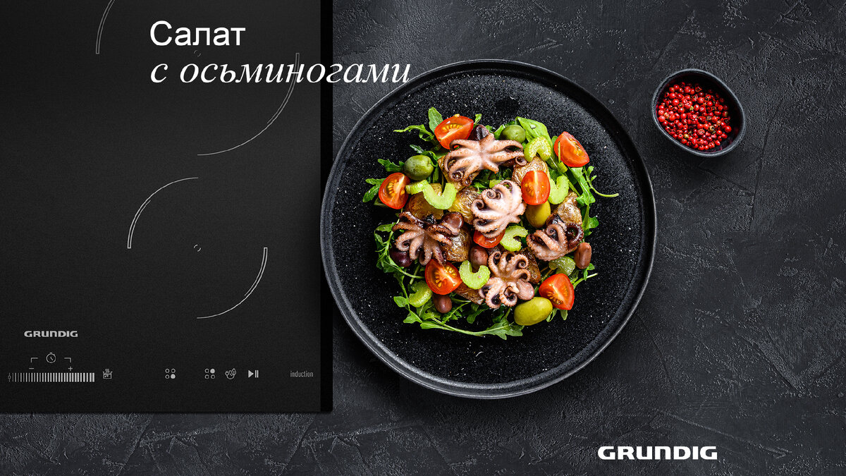 Беби-осьминоги можно приготовить разными способами, например, сварить суп, добавив другие морепродукты. Еще осьминожек часто добавляют в салаты. Сегодня мы поделимся с вами таким рецептом. Мини-осьминоги порадуют и тех, кто соскучился по морю и тех, кто хочет приготовить вкусное и полезное блюдо. В них много белка, витамина B12, цинка и селена. Чистить маленьких осьминогов не нужно, в их кожице много полезных микроэлементов, а загрубеть она ещё не успела. А название «беби» осьминожки получили из-за того, что вылавливают те особи, которые пока ещё не достигли размера детской ладошки. 1. В кастрюлю налить воду, довести до кипения на варочной панели Grundig GIEI624470PF и положить осьминогов, варить 20 минут, слить воду и отставить остывать. 2. В отдельной миске приготовить заправку. Налить оливковое масло, бальзамический уксус, соль и свежемолотый черный перец, тщательно перемешать. 3. На тарелку выложить рукколу и осьминогов, вылить часть заправки, перемешать, оставить на 10 минут. 4. Н