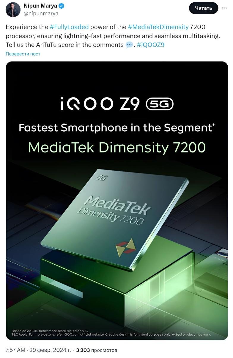 Запуск смартфона IQOO Z9 уже совсем близок, и компания представила новые тизеры этого будущего устройства. Один из тизеров утверждает, что IQOO Z9 будет самым быстрым телефоном в своем классе. Генеральный директор IQOO India поделился изображением в качестве доказательства, что IQOO Z9 5G действительно будет самым быстрым смартфоном в своей категории благодаря процессору MediaTek Dimensity 7200 SoC. Предполагается, что стоимость Z9 будет около 20 000 индийских рупий (примерно 22 200 рублей). Таким образом, этот предстоящий смартфон несомненно станет одним из самых мощных устройств в этом ценовом диапазоне. Хотелось бы напомнить, что этот же чипсет используется в смартфонах Redmi Note 13 Pro+, IQOO Z7 Pro, Vivo V27, Vivo T2 Pro 5G и других. Кроме того, официальная страница IQOO в социальных сетях также опубликовала еще одно тизерное изображение, демонстрирующее IQOO Z9 в зеленом цвете. Судя по полученной информации на данный момент, Z9 5G будет оснащен 120-герцевым OLED-дисплеем с разре
