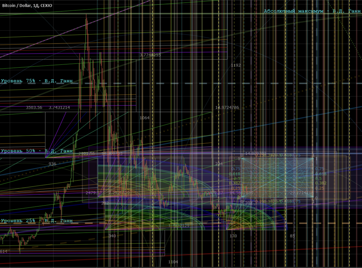 За свою жизнь Ганн стал легендарной фигурой и прославился как астротрейдер. Он разработал множество инструментов для анализа сырьевых товаров, акций и др. Уверена, что многие у вас на слуху. Среди них: уровни Ганна, сетка, веер, квадрат девяти, геометрические углы и даже космограмма. Конечно, лучше всего они работают при совмещении. Главное, не делайте, как на фото ниже.