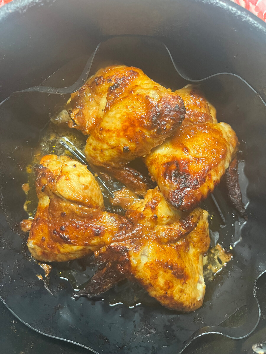 Приготовим простую, быструю и легкую в приготовлении закуску к пенному. нам понадобится: Крылья моем, крайнюю фалангу можно удалить, я ее оставил, так же можно крылья разрезать пополам по суставу, кому хочется. В миске готовим маринад из остальных ингредиентов, перекладываем крылья в маринад и все хорошо перемешиваем. Можно накрыть крышкой, пищевой пленкой и убрать в холодильник, 30 минут достаточно, я использовал вакууматор, переложил крылья в специальный пакет, залил все маринадом и выкачал весь воздух из пакета, и так же убрал в холодильник на 30 минут. Считается, что в вакууме, мясо маринуется быстрее чем без него, я этого не проверял, ничего сказать не могу. Перекладываем крылья в чашу прибора, выставляем 180 градусов на 10 минут, достаем крылья, переворачиваем их, поливаем остатками маринада и снова ставим в аэрогриль на 10 минут После звукового сигнала, достаем крылья и наслаждаемся прекрасной закуской не только к пенному но и к любому гарниру. приятного аппетита!!)