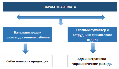 Ярким примером может служить способ отражения заработной платы работников производственного цеха и заработной платы главного бухгалтера и сотрудников финансовой службы. В первом случае расходы, понесенные на выплату заработной платы в полном объеме необходимо включить в себестоимость выпускаемой продукции. Во втором – следует отнести на управленческие расходы, поскольку финансисты не участвуют в производстве продукции.