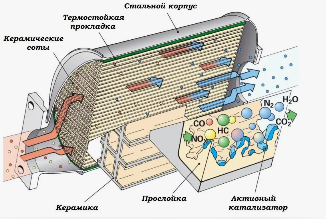 Катализатор – это устройство, которое устанавливается в выхлопной системе автомобиля и служит для очистки отредактированного углерода (CO), окиси азота (NOx) и углеводородов (HC), которые образуются при сгорании топлива в двигателе. Катализатор состоит из металлического корпуса, внутри которого находятся керамические соты, покрытые платиной, палладием и родием – катализаторы, способные ускорить химические реакции и превратить вредные вещества в более безопасные.