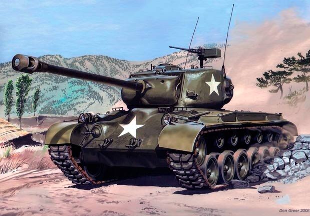 Танк M26 Pershing – один из самых известных и важных американских танков периода Второй мировой войны и последующих конфликтов. Его история создания и технические характеристики представляют собой увлекательную главу в развитии танкового дела. Идея создания M26 Pershing возникла после опыта противостояния американских танков с немецкими тяжелыми танками Tiger и Panther во время войны. В 1942 году началась разработка нового танка, целью которой было создание мощного тяжелого танка, способного соперничать с немецкой бронетехникой. Итак, M26 Pershing был создан как ответ на возрастающий уровень угрозы со стороны тяжелых немецких танков. Он был назван в честь генерала Джона Дж. Першинга, который командовал американскими войсками в Первую мировую войну. Первые прототипы были готовы в середине 1944 года, и серийное производство началось в начале 1945 года. M26 Pershing был вооружен с более мощным 90-мм пушкой и имел более толстую броню по сравнению с предыдущими моделями танков. С этими