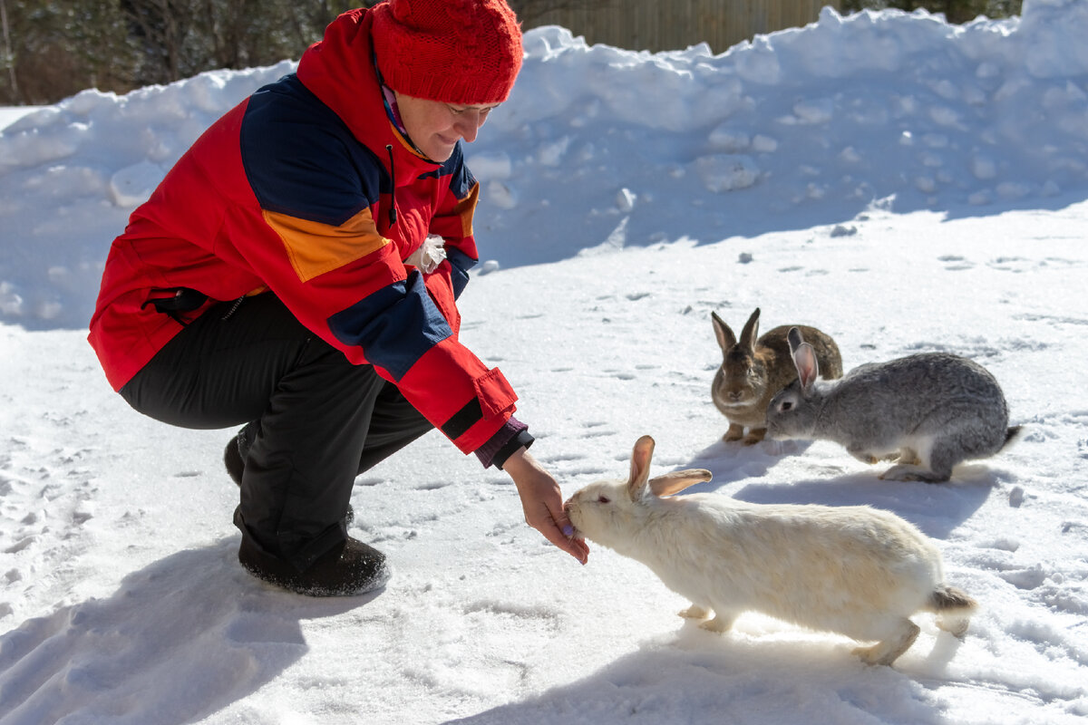 Ехали долго, несколько часов. Пролетали невероятные красоты – благо накануне насыпало кучу снега и все было белым-бело! В конце концов остановились, как мне показалось, на краю земли – кругом белоснежные поля, домик и… КРОЛИКИ! Да-да-да, самые настоящие живые кролики скакали под ногами без клеток, поводков и намордников!