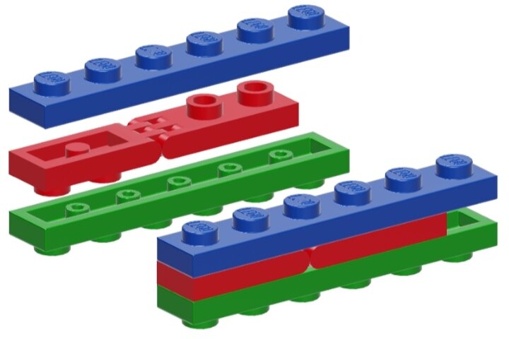 В прошлой статье Были рассмотрены развороты на 180°. Сегодня мы продолжим эту тему, рассмотрев ещё несколько более компактных вариантов. "Бутерброд" можно сделать с толщиной перехода всего в 1 плейт: А весь секрет в применении связки из двух деталей, одна из которых просто развёрнута. Несмотря на то, что эти детали соединены гибким шарниром, плейты сверху и снизу закрывают изгиб и итоговая конструкция получается очень прочной. Почему же эту чудо-идею без видимых минусов не используют в наборах и её не так часто можно увидеть в работах строителей? А вот, например, конструкция толщиной в два плейта, влезающая в пространство 2 x 2 штырька: Детали очень простые и распространённые — круглый тайл с отверстием 15535 и плейт со штырьком посередине, причём можно использовать как квадратный его вариант под артикулом 87580, так и круглый 18674. Ещё один вариант SNOT, использующий отверстия в деталях, завязан на использовании техник-плейта 2 x 4 (номер детали ЛЕГО 3709) и… цветов. Да, это не оп