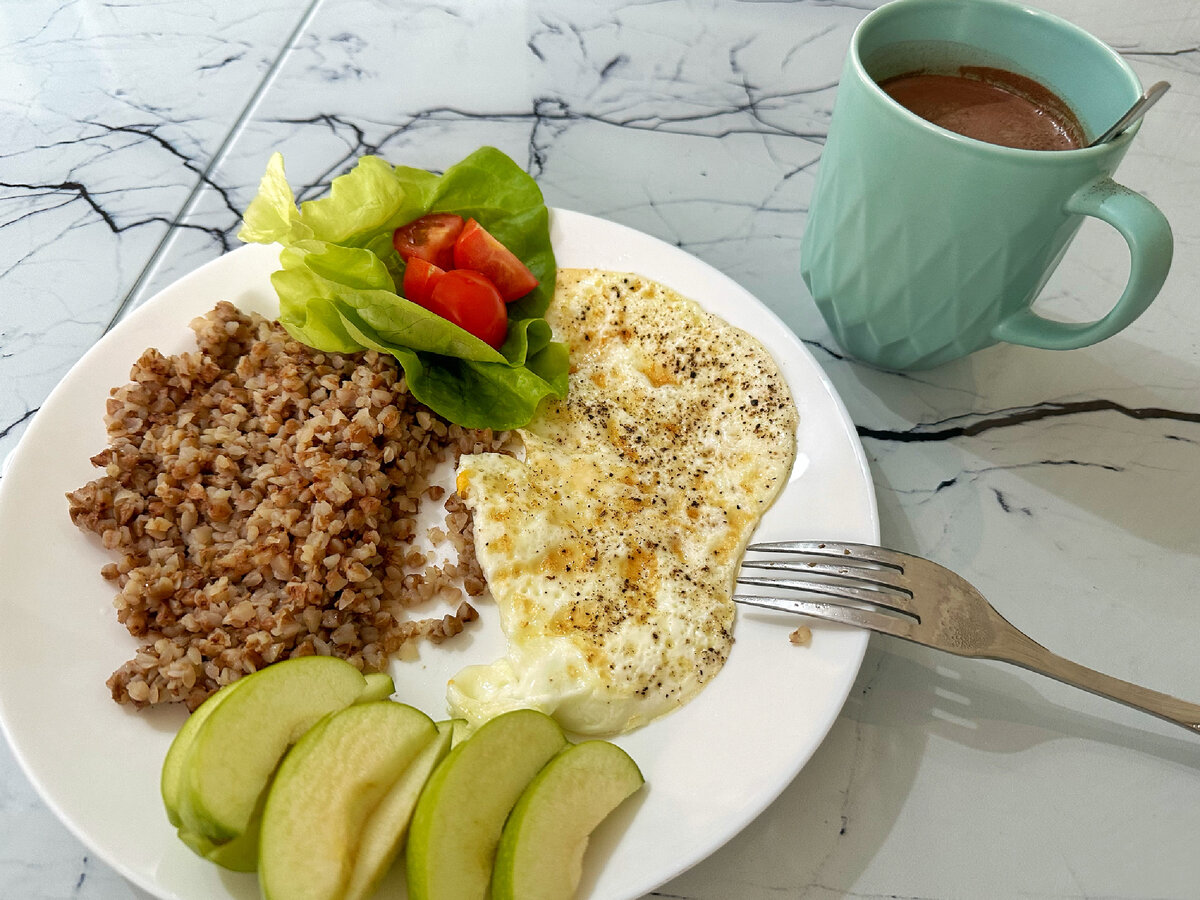 Завтрак: вареная гречка, жареный белок яйца (не люблю желток), листья салата, помидор, яблоко, горячий шоколад.