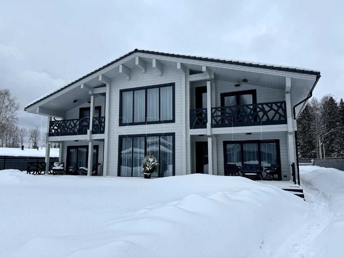 Строительство выполнялось по индивидуальному проекту, который был также разработан в нашей компании. Общая информация по проекту: Площадь 1 этажа - 266,0 м2 Площадь 2 этажа - 189,6 м2 Общая площадь - 455,6 м2 Высота потолка в помещении 1-го этажа - 2 696 мм. Высота потолка в помещении 2-го этажа- 1954 / 4 309 мм. Высота боковых стен до начала скоса - 5 185 мм. Фундамент: плита на свайно-ростверковом фундаменте; Клееный брус с сесчением 200х180 мм; Окна: профиль ламинированный Rehau DELIGHT 70 мм, с двухкамерным стеклопакетом и энергосберегающим напылением; Кровля: двускатная, цементно-песчаная BRAAS; Подшива: планкен, скошенный из доски хвойных пород; Утеплитель: PAROC eXtra, Утепление 200 мм; Ограждения террас выполнены из цельного металлического листа с узорами, изготовленными посредством лазерной резки; Покраска: масло OSMO Landhausfarbe; За более подробной информацией по данному проекту, оставляйте заявку на сайте или обращайтесь по телефону ниже. ————————— Сайт: nvle.ru Тел: +7 (4