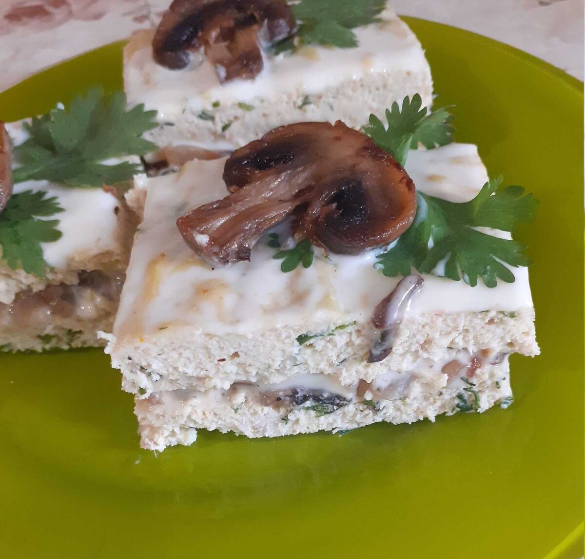 Накрываем вторым слоем мясного коржа, украшаем листикам зелени, и разрезаем на «пироженки».