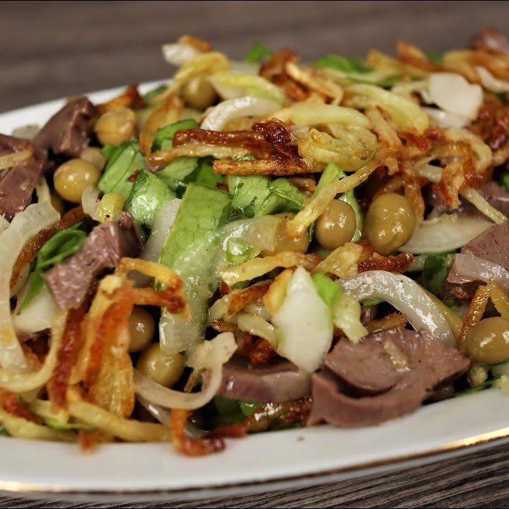 Сваренные заранее сердечки режем соломкой и добавляем к салату.