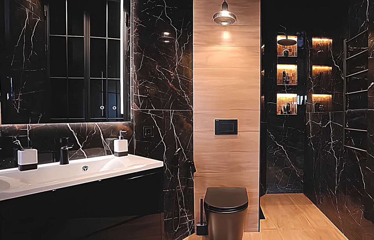 Нестандартная планировка, стеклянные двери, много хранения и другие классные решения, которые придумали сами! Немногие решатся использовать черный цвет в ванной. Но наши герои, супруги Светлана и Алексей Чайковские, не из робкого десятка. Они специально купили квартиру неправильной сложной формы и оформили треугольный санузел, сделав ставку на черный цвет. Дизайн и функционал каждого уголка хозяин продумал самостоятельно. От основного пространства санузел отделили перегородкой из матового стекла. Оно обладает отличной светопропускной способностью и в то же время обеспечивает высокую степень приватности. Таким образом поддержали общую концепцию интерьера, в котором все перегородки между зонами выполнены из стекла и графичного черного профиля. Для отделки пола выбрали плитку «под дерево» и установили систему «теплый пол». Стены оформили черным глянцевым крупноформатным керамогранитом с текстурой мрамора с контрастными белыми прожилками. Один из самых смелых приемов, который всегда произв
