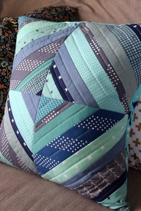 ...посмотрите на эти дивные диванные подушки, все они сшиты по одной схеме, а именно - диагональные полосы нашиты на квадратную заготовку , а затем их соединили в единое полотно...