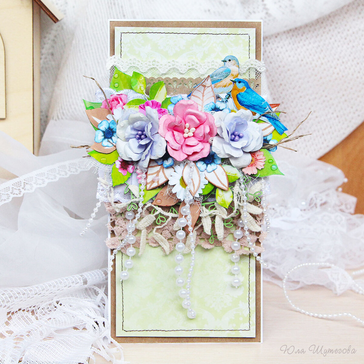 Декоративные цветочки ручной работы, птички, кружево и жемчужные бусы идеально соединились в этой весенней открытке