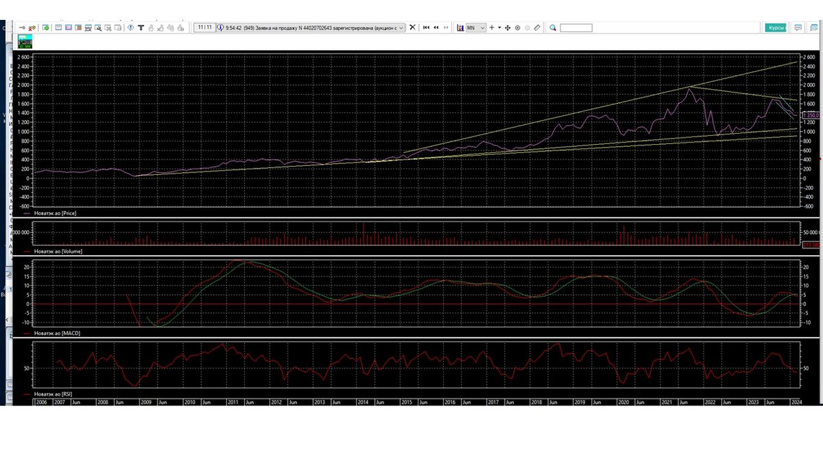 Недельный график показывает, что акция НОВАТЭК находится в середине расширяющего растущего тренда 900-2500, где с октября 2022 года внутри тренда зародился сужающейся коридор 900-1700.