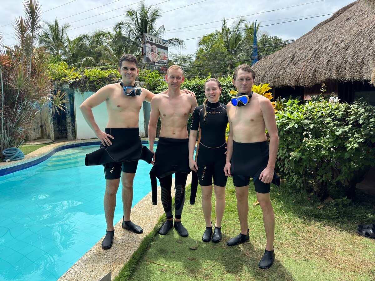 Привет, народ ещё одно красивое слово на -инг испробовали на вкус планы бешеные. сначала сдать тачку, а потом на дайвинг. ребята, кроме васи и меня, еще ни разу не погружались глубоко в воду с аквалангом. надо просто освоить небольшие правила - не паниковать и правильно продуваться. вася то вообще как полупрофи, у него аж сертификат дайвера есть. что касается меня, то погружался в Красном море (Шарм Шейхе) в году так 2015. ну в общем, проблем с тачкой не было, и школа дайвинга встретила нас радужно - русскоязычный инструктор попался. сначала был краткий экскурс в теорию. потом нас одели, обули, подготовили снаряжение и повели в бассейн. просто в обычный бассейн при отеле. вот такой дайвинг 👍👍👍, воо стоишь сначала на коленках, лежишь потом плашмя лицом вниз, лежишь дышишь, потом тебя водят кругами по бассейну и учат погружаться. рассказали какие жесты нужно знать всем: 👌 - всё ок 👍 - поднимаемся на верх 👎 - погружаемся вниз 🫳 - есть проблемка в целом инструктаж прошли, врод