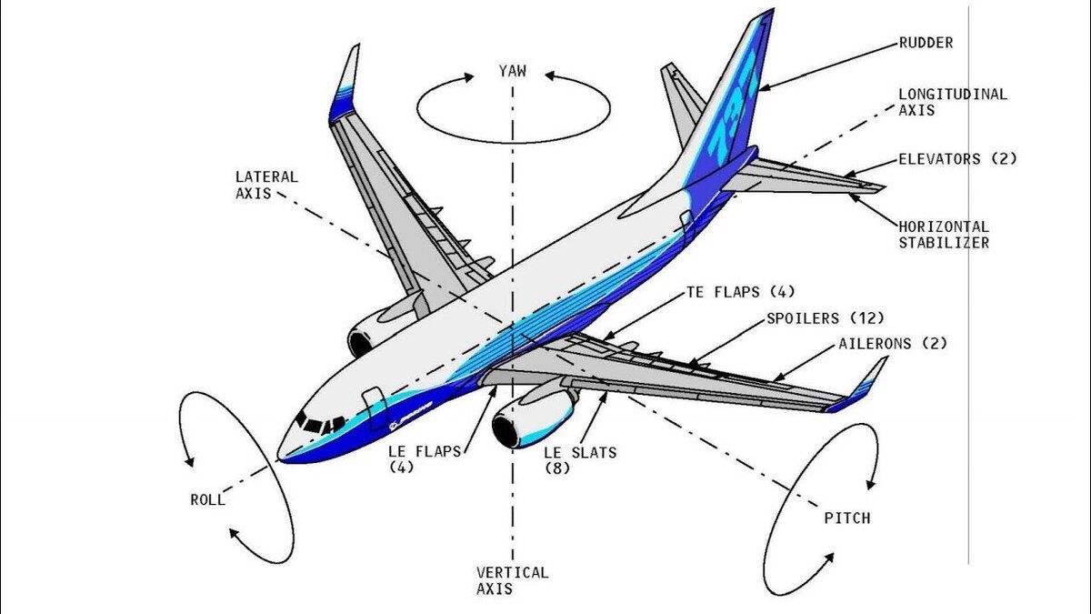 Про оси движения самолёта, она же связанная система координат, или aircraft principal axes. За каждую ось вращения работает определённый элемент механики и фюзеляжа. Поперечная ось, “тангаж”, “pitch”: отвечает за направление носа вверх-вниз, необходимое при наборе высоты и снижении. Управляется рулём высоты, он же elevator на горизонтальных прихвостовых крыльях. Тут, кажется, всем из фильмов известно, что за это отвечает штурвал при движении к себе и от себя. Продольная (горизонтальная) ось, “крен”, “roll” и “bank”: отвечает за наклон крыла и управляется алиеронами, небольшими подвижными закрылками, которые поднимаются и опускаются в противоположном друг от друга направлении и управляются штурвалом. Нормальная (вертикальная) ось, “рысканье”, “yaw”: отвечает за поворот носа самолёта вправо и влево. Управляется через руль направления, или rudder. Этот руль связан с кабиной пилота посредством педалей и он же обеспечивает поворот самолёта при движении по земле (а не штурвал). Вот видео вс
