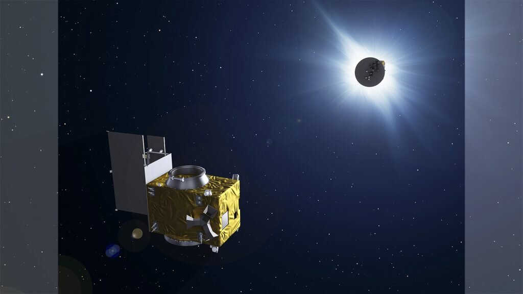 Европейское космическое агентство запустит пару «синхронных» спутников, которые будут исследовать солнечную корону. Европейское космическое агентство испытало лазерную систему, которая будет удерживать спутники миссии «Проба-3» в «синхронном движении на орбите. Это необходимо, чтобы тень одного из них — «Оккультер» — создавала искусственное солнечное затмение, закрывая светило на камерах «Коронографа». Два спутника вместе образуют солнечный коронограф длиной 144 м для изучения слабой солнечной короны ближе к краю звезды, чем когда-либо прежде. Чтобы наблюдения были успешными, спутники должны сохранять позиционирование на орбите. Иллюстрация искусственного затмения при движении спутников миссии «Проба-3». Изображение: ESA — P. Carril, 2013. Сведения о лицензии По замыслу разработчиков, тень «Оккультера» будет закрывать яркий солнечный шар, оставляя видимой только внешнюю атмосферу звезды. Двигаясь по 19,5 часовой орбите спутники смогут изучать корону в течение 6 часов. Но для того, чтоб