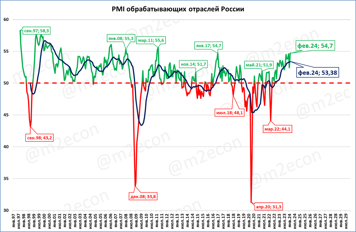 Индекс деловой активности в обрабатывающей промышленности (PMI Manufacturing) от S&P Global в феврале составил 54,7 пункта (52,4 в январе). Выше нынешнего индекс был в последний раз только в марте 2011 года, 13 лет назад. Если же рассматривать только феврали, то нынешний стал третьим лучшим февралём за всю историю. Для справки: рост ВВП в 2000 году составил +10%, в 2011 году +4,3%. Среднее значение индекса за последние 12 месяцев выросло до 53,4 пункта (53,3 месяцем ранее), см. синюю линию на графике ниже. Это лучшее значение с 2008 года (за 16 лет). Оценка: индекс говорит о лучшем с 2008 года росте деловой активности в промышленности России в первые месяцы 2024 года. P.S. Ориентироваться в моих статьях, заметках и видео удобно через НАВИГАТОР Более полный перечень статей с разбивкой по темам есть ЗДЕСЬ. ___ Раньше всего материалы публикуются в Дзен и Телеграм Телеграм : https://t.me/m2econ Дзен : https://zen.yandex.ru/m2econ Подписывайтесь! Буду благодарен вам за лайки и комментарии