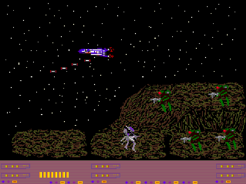 Пиксель арт на сегодня по мотивам видеоигры Target Earth для игровой приставки Sega Megadrive. Стрелялка из первой половины жизненного цикла системы. Вполне себе, думаю, интересная. Про роботов. Космос. Уверен, что это серьёзная фантастическая тема. И приличный боевик. Что для видеоигры - то что надо. Это про космос и роботов. Уже все хорошо. А это мой рисунок на подобную тему. Планета Альтакс подверглась нападению зеленых киборгов. Зелорги. Они осуществляют высадку на поверхность планеты. На планете слабая атмосфера и все тут ходят в скафандрах. Или в костюмах роботов. Тут много научных станций и есть города. Поверхность планеты серая и коричневая. Небо темное. Не самое примечательное место во вселенной. Но именно Зелорги прилетели. И именно сюда. Они считают, что здесь находится технология древних, зарытая в глубь этой планеты. Или рядом на соседних планетах. Землю здесь копать тяжело, очень плотный грунт. Раскопками мало кто здесь занимается. А часть правды в этом есть. Это серия п
