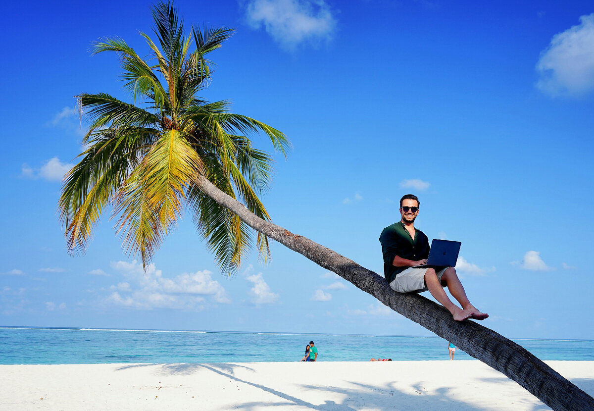 С человеком, который лежит на шезлонге под пальмой, в одной руке у него ноутбук, другой – коктейль, а на фоне бескрайний океан?
