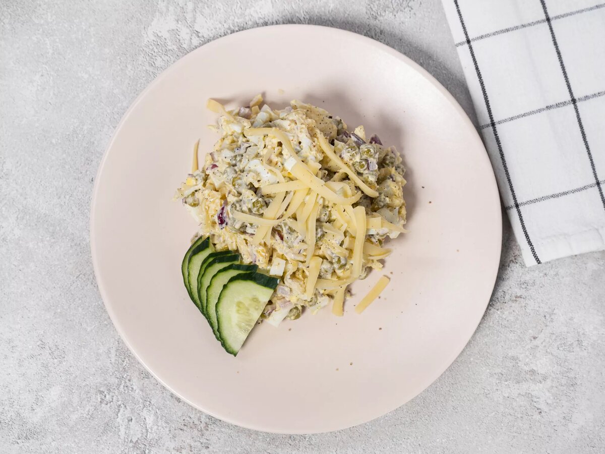 4. Соедините в салатнике яйца, лук, сыр и зеленый горошек.