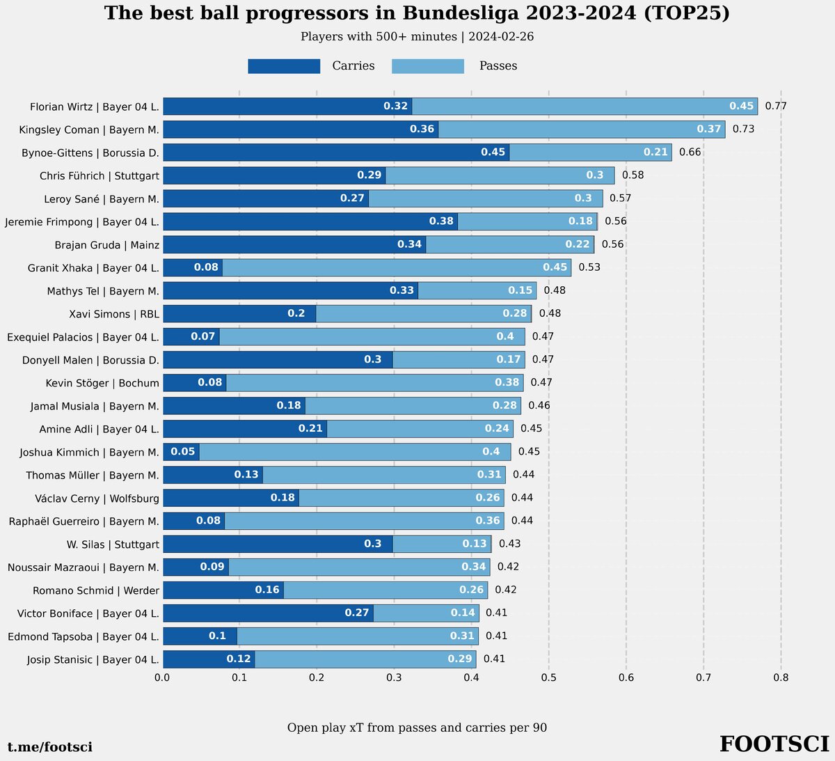 Также хочется еще раз выделить Виртца и указать на то, что его показатели являются довольно сбалансированными. На первом месте в аналогичных рейтингах для в АПЛ и ЛаЛиги находятся игроки, которые большую часть по xT набирают через дриблинг.