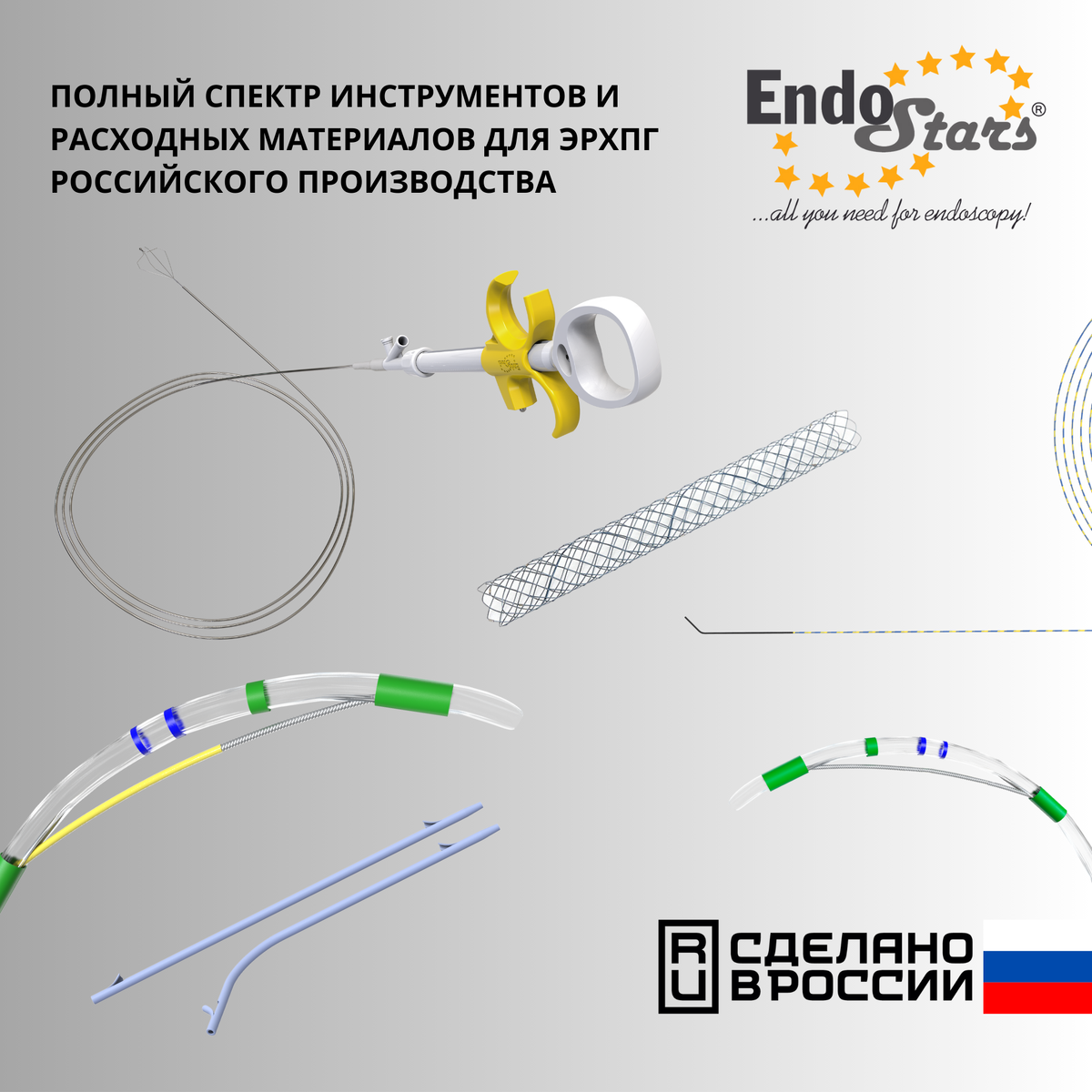 Линейка эндоскопических инструментов Эндо Старс для лечебной ЭРХПГ включает в себя всё самое необходимое для канюляции, дренирования, стентирования, папиллотомии, удаления камней из желчных протоков и пр.