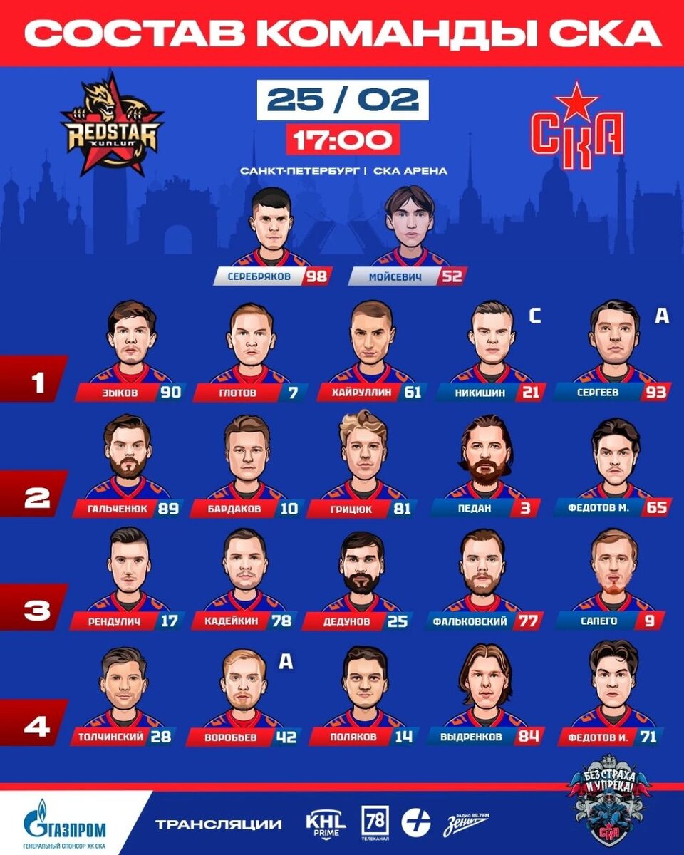 Уже через 7 часов начинается плей-офф для СКА. Один из самых волнующих вопросов: какой состав выведет команда на игру с Торпедо? Не дожидаясь, я всё же решила написать не о том, что выставят на плей-офф, а что было в регулярке (на примере последнего матча, но состав плюс-минус выглядел основным), а также высказать своё мнение относительно того, все ли на своих местах. Вратари: Серебряков, Мойсевич. Тут, я думаю, всё на своих местах, хотя и считаю, что лучше бы дали Никите отдохнуть ближе к главным матчам. Запасной вратарь тоже очень надёжен, но расстраивает, что очень мало времени получает Маттссон. Надеюсь, в плей-офф времени будет выделяться больше, потому что регулярка показала, что Серебряков может уставать. 1 звено: Зыков, Глотов, Хайруллин, Никишин, Сергеев. Начну с того, что Ротенберг решил отказаться от статусности звеньев и сделать их примерно равными (ну, почти). Нападающие подобраны отлично, потому что Глотов и Хайруллин отлично сыгрались, да и Зыков с ними смотрится оч