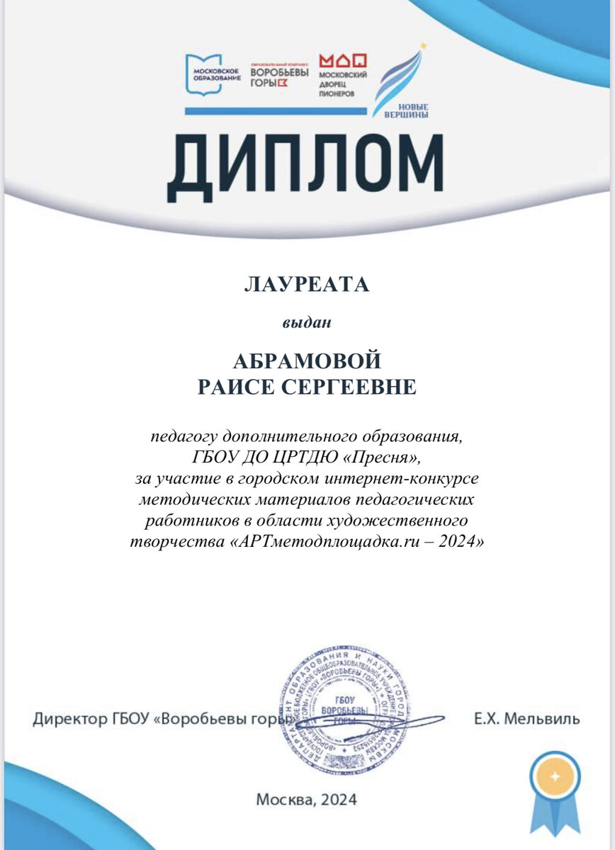 Наши педагоги получили звания лауреатов конкурса «Артметодплощадка.ru-2024» Городской интернет-конкурс методических материалов педагогических работников в области художественного творчества «Артметодплощадка.ru-2024» известен высоким уровнем участников и победителей конкурса В конкурсной программе «Новые вершины» получили 🏅 Абрамова Раиса Сергеевна - диплом лауреата 🥈Минаева Гульнара Ринатовна, Валентинская Елена Борисовна, Королева Надежда Александровна, Халикова Регина Фиринатовна, Ильина Ольга Геннадьевна - дипломы лауреатов II степени. 👏🏻 Поздравлем и гордимся нашими педагогами! #ДОНМ #ДопОбразование #ЦентрТворчестваПресня