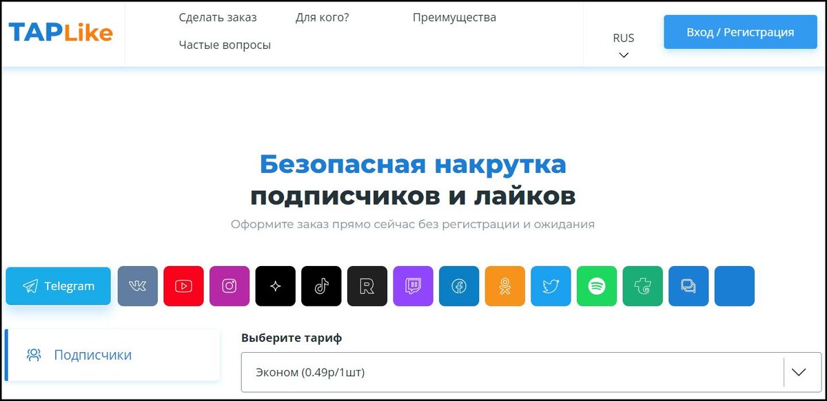 Оформить заказ можно даже без регистрации. Стоимость одного подписчика в Телеграм начинается от 0,36 рублей. Помимо подписчиков можно заказать просмотры, реакции, репосты и комментарии. Сервис также предлагает и менее распространенные услуги, такие как бусты и привлечение рефералов в игровых ботов.