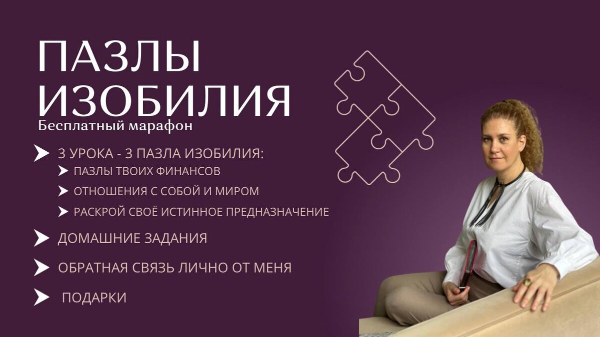 Я создала для вас уникальный марафон, который НЕОБХОДИМО пройти каждой, если: 🟥 У вас сложные отношения с собой, вы часто критикуете себя, недовольны собой, сомневаетесь в себе 🟥 У вас сложные отношения с деньгами 🟥 Сложные отношения с мужчинами 🟥 Откладываете жизнь на потом или выгораете, не доходя до цели В рамках МАРАФОНА вы получите 3 урока - 3 КЛЮЧЕВЫХ ПАЗЛА ДЛЯ ВАШЕГО ИЗОБИЛИЯ↙️ 🧩 ПАЗЛЫ ТВОИХ ФИНАНСОВ 🧩 ОТНОШЕНИЯ С СОБОЙ И МИРОМ 🧩 РАСКРОЙ СВОЕ ИСТИННОЕ НАЗНАЧЕНИЕ 📣А ТАКЖЕ ВЫ ПОЛУЧИТЕ ОБРАТНУЮ СВЯЗЬ ЛИЧНО ОТ МЕНЯ, ДОМАШНИЕ ЗАДАНИЯ И 🎁ПОДАРКИ🎁 ЗА КАЖДОЕ ВЫПОЛНЕННОЕ ДЗ: 🎁 Авторскую практику медитацию, для проработки ваших финансовых блоков 🎁 Авторскую практику по обретению ценности и целостности ваших границ 🎁 Авторскую практику «ТВОЯ ИСТИННАЯ МИССИЯ» 🧩СОБЕРИТЕ ПАЗЛЫ СВОЕГО ИЗОБИЛИЯ, СТАНЬТЕ ЦЕЛОСТНОЙ И САСТЛИВОЙ ЖЕНЩИНОЙ, ОТЗЫВЫ И КЕЙСЫ МОИХ КЛИЕНТОВ ТУТ ➡️ https://t.me/otzovi_psiholog НАЧНИТЕ УЖЕ СЕЙЧАС https://t.me/PUZZLE_IZOBILIE_BOT